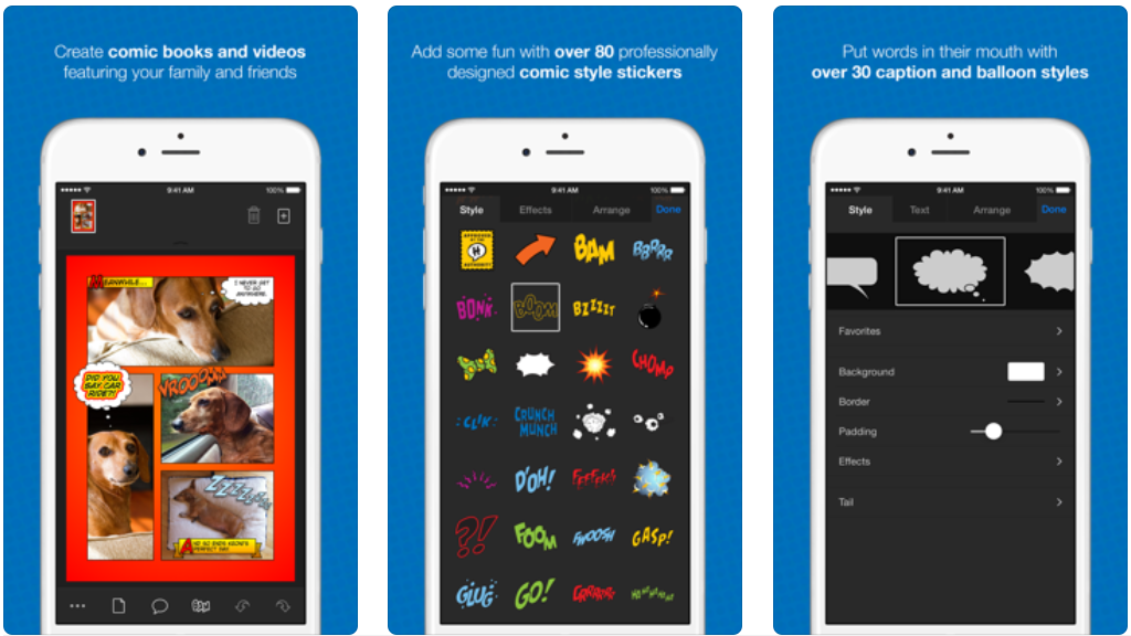 Para lograr esto, la aplicación dispone de una amplia variedad de fondos, subtítulos, globos, sellos, filtros y efectos. De esta manera, permite crear divertidas y atractivas caricaturas. Además, estas creaciones también pueden ser convertidas en videos, a los cuales, se les puede agregar música y efectos de sonido.